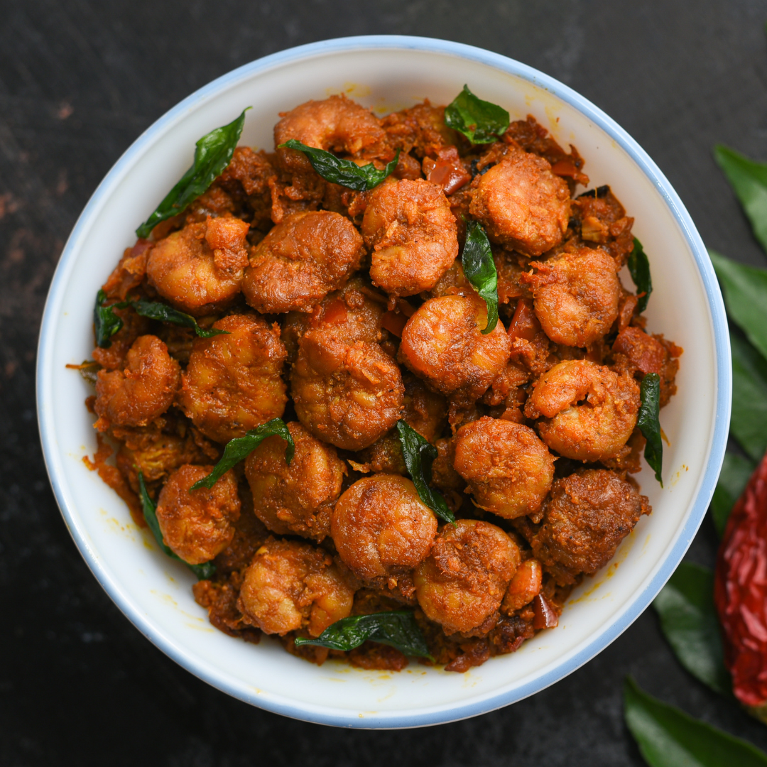 Spicy, crispy prawns seasoned with aromatic herbs and spices.